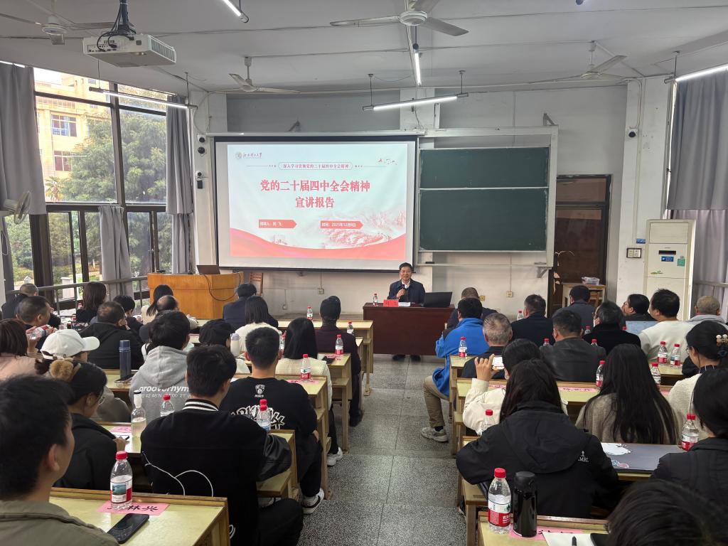 为深入学习贯彻党的二十届四中全会精神,激发师生员工干事创业的激情。12月9日,校党委常委、纪委书记、监察专员刘飞在红旗校区主教楼208教室为经济管理学院师生宣讲党的二十届四中全会精神,经济管理学院全体领导班子成员及学生代表参加。